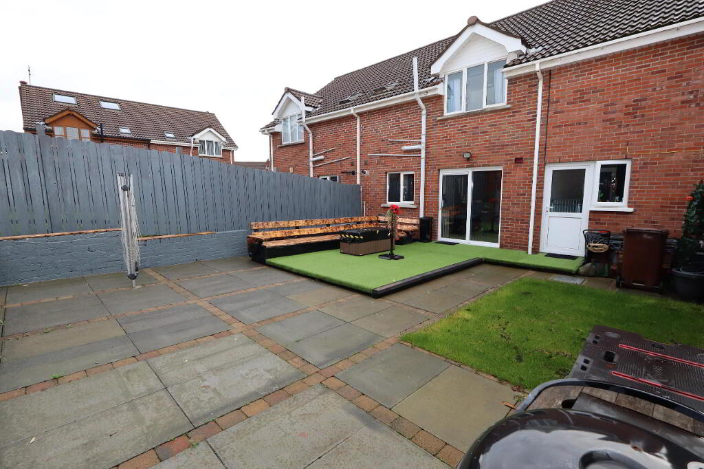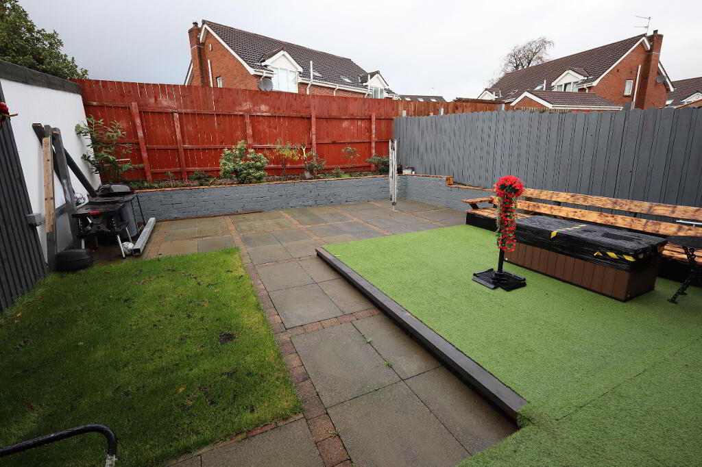 Rear: paved patio area, plants and shrubs, in lawn, outside sockets