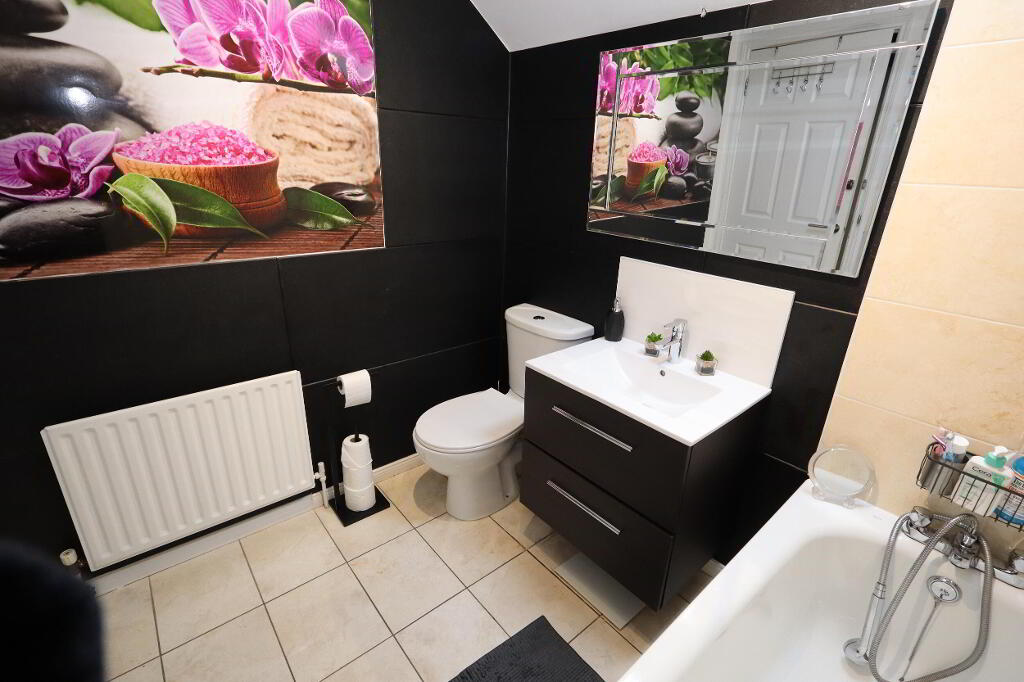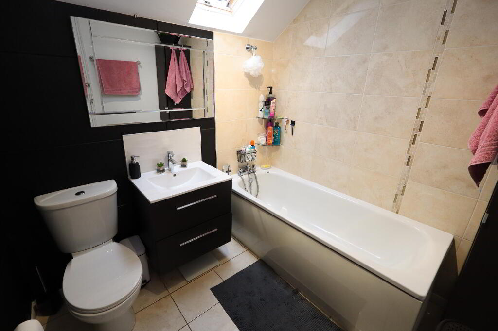 BATHROOM Modern white bathroom suite, low flush W/C, wall hung vanity unit with mixer tap, panelled bath with mixer tap, and hand shower, tiling, ceramic tiled flooring, Velux window, extractor fan