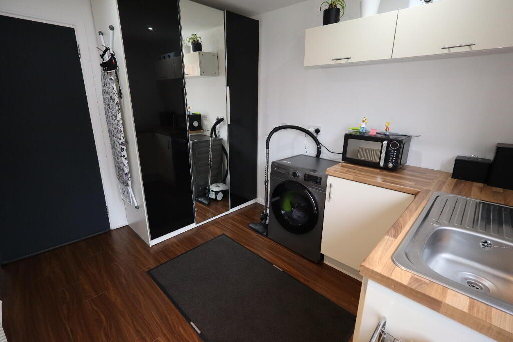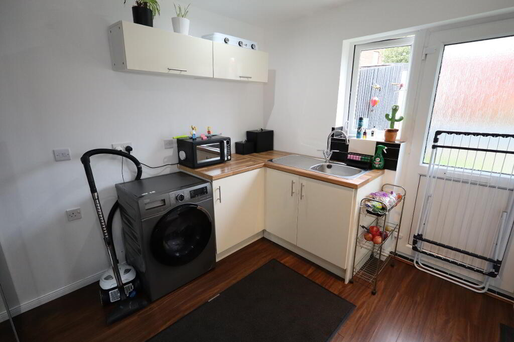 UTILITY ROOM 10' 4" x 8' 4" (3.15m x 2.54m) Range of units, round edge worksurfaces, stainless steel sink unit with mixer tap, laminate wood flooring, door to rear
