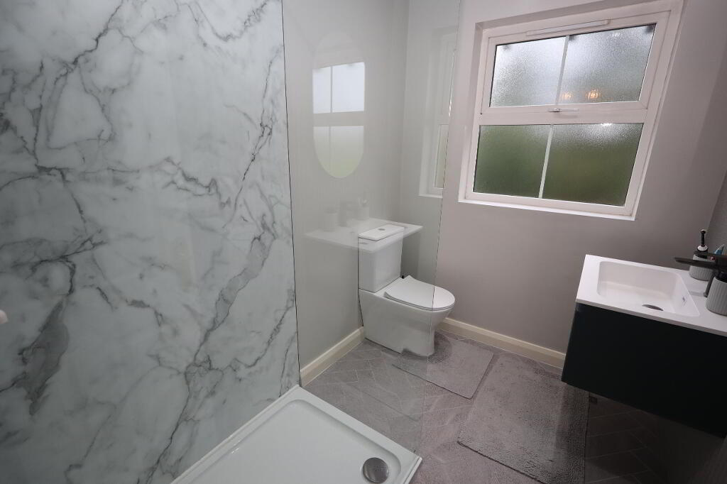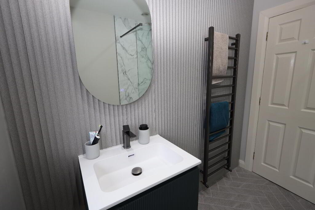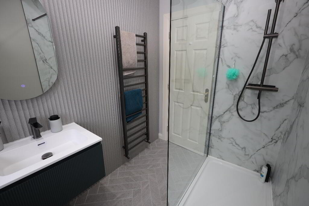 BATHROOM Modern 3 piece shower room comprising double shower enclosed with thermostatic controlled shower unit and rainfall shower head, floating half pedestal wash hand basin with mixer tap and under bench storage, push button WC, contemporary wall panelling, herringbone tiled flooring, matt black heated towel rail