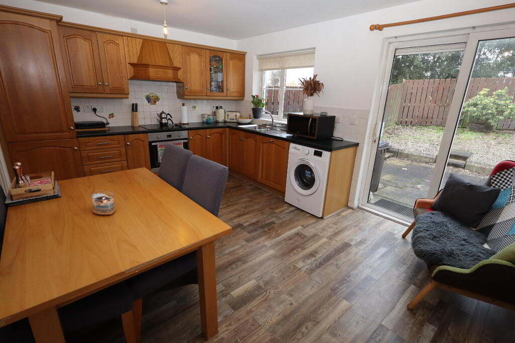Concealed extractor canopy, built in hob, built in oven, space for washing machine, 1 1/2 built in stainless steel sink unit with mixer tap and drainer, built in storage cupboard and pantry, built in dishwasher, built in fridge freezer, sliding patio door, laminate wooden flooring, part wall tiling.