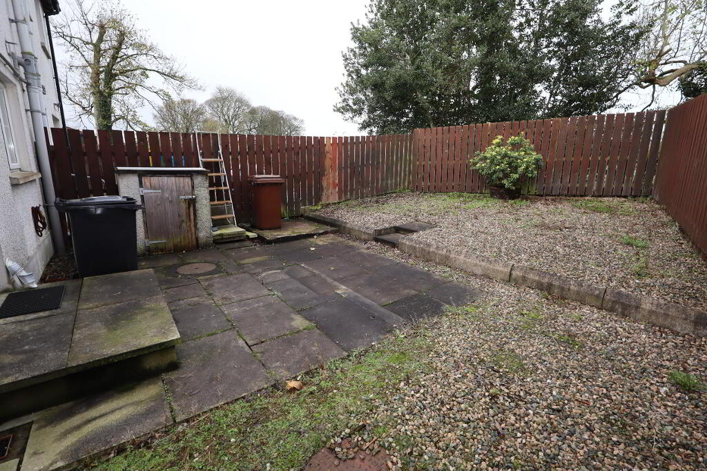 Rear: yard laid in stones with paved patio area, oil boiler housing, outside light