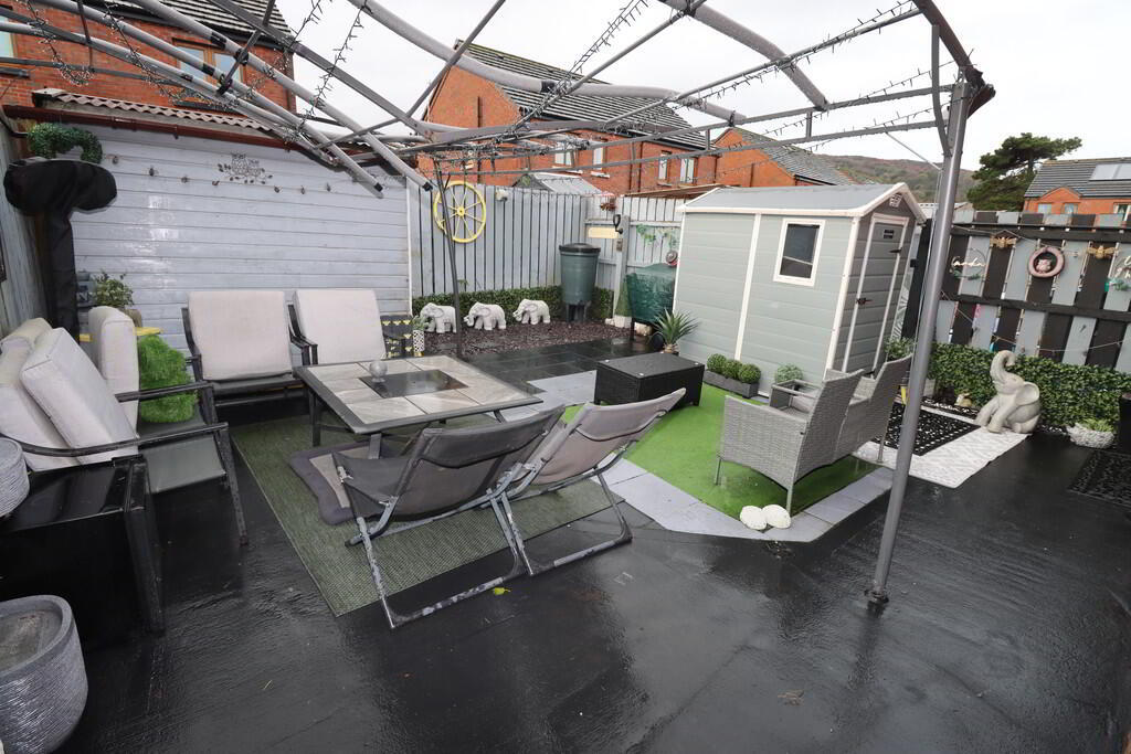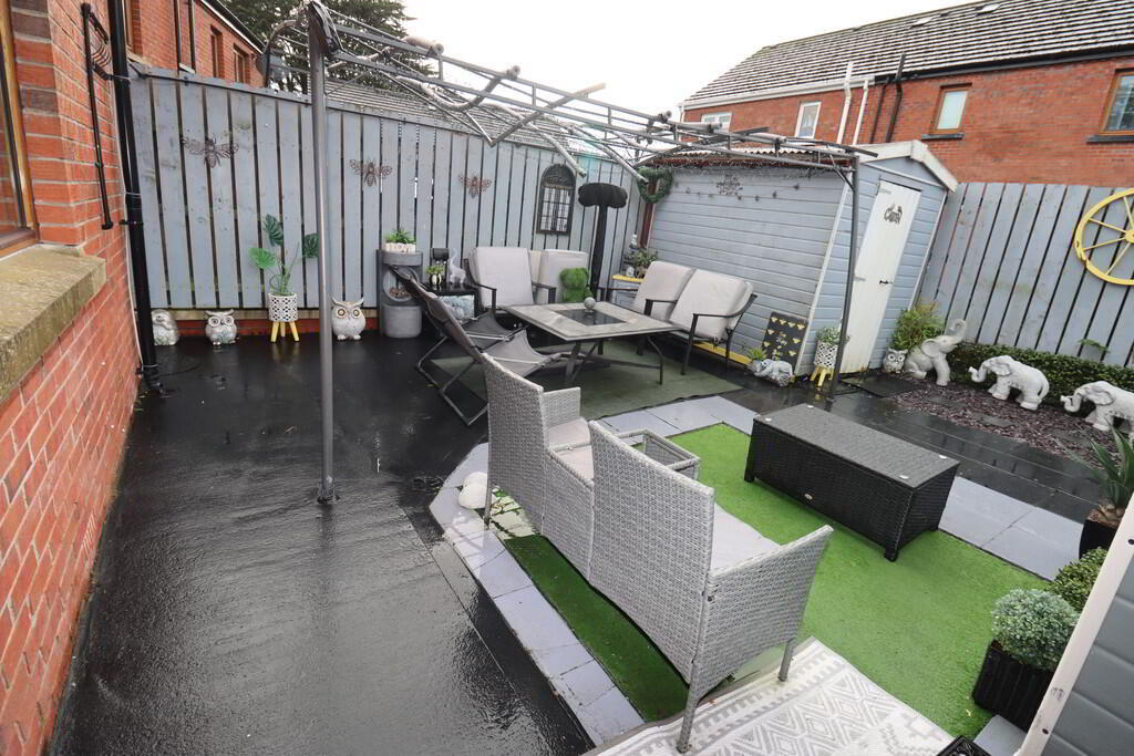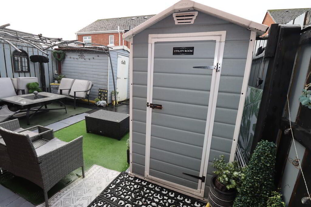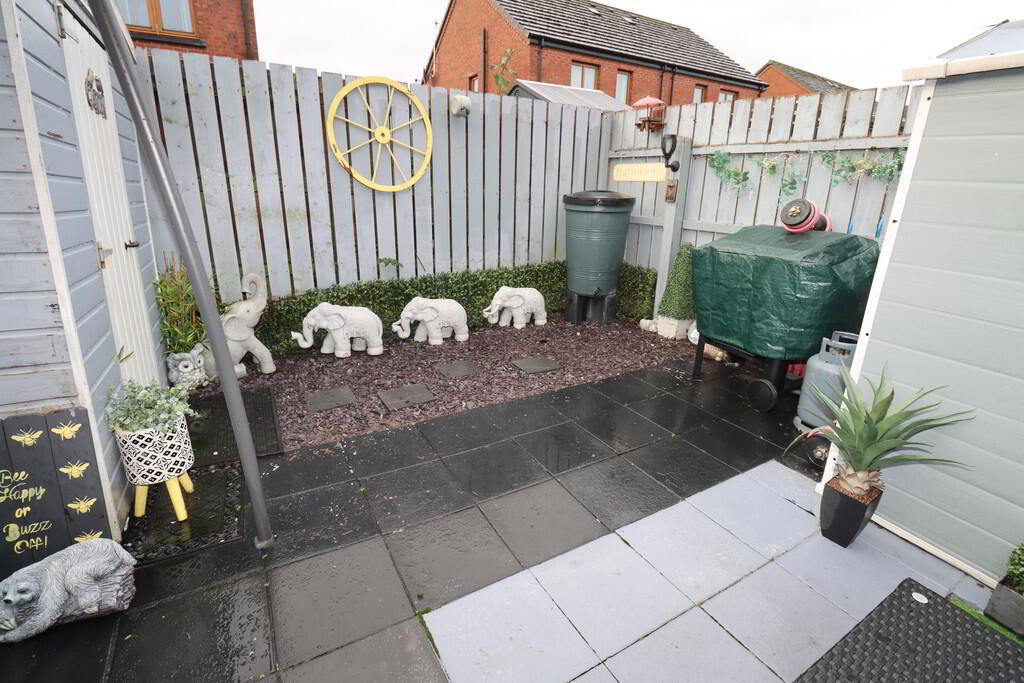 Rear: Enclosed to rear, neat paved patio, in stones, external shed wired for tumble dryer and plumbed for washing machine, separate shed with power, external double socket