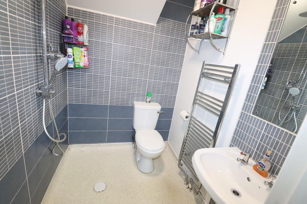 WASHROOM Controlled shower, low flush W/C, pedestal wash hand basin, chrome heated towel rail, ceiling extractor vent, panelling