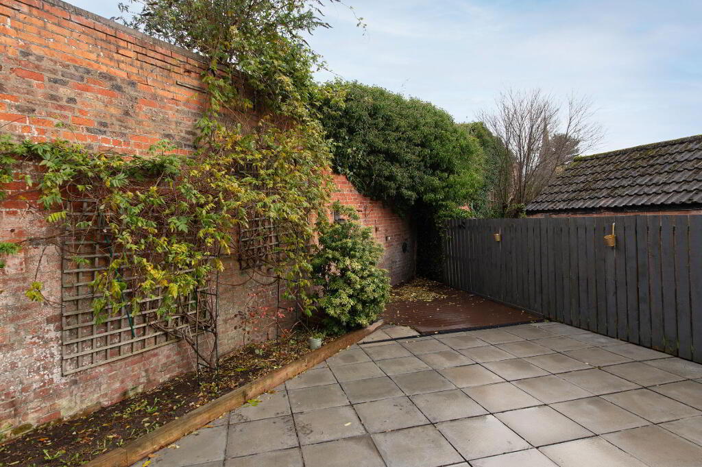 Rear: enclosed feature walls, paved patio area, outside tap