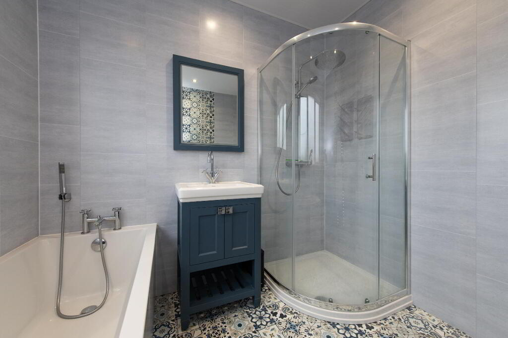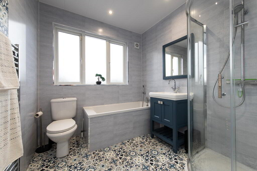 BATHROOM White suite, panelled bath, vanity unit with mixer tap, ceramic tiled flooring, heated towel rail, shower unit with controlled shower, uPVC panelling, downlighters, uPVC ceiling