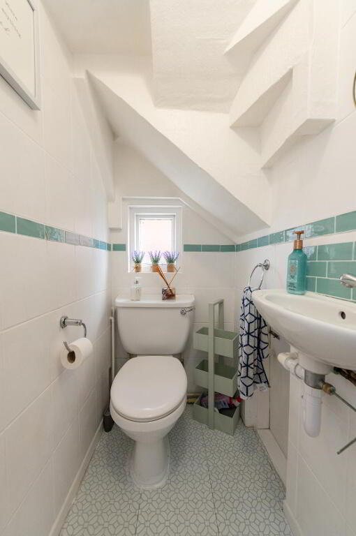 CLOAKS Low flush W/C, pedestal wash hand basin, ceramic tiled flooring, tiling, extractor fan