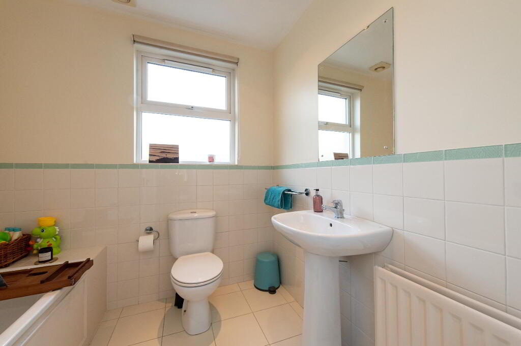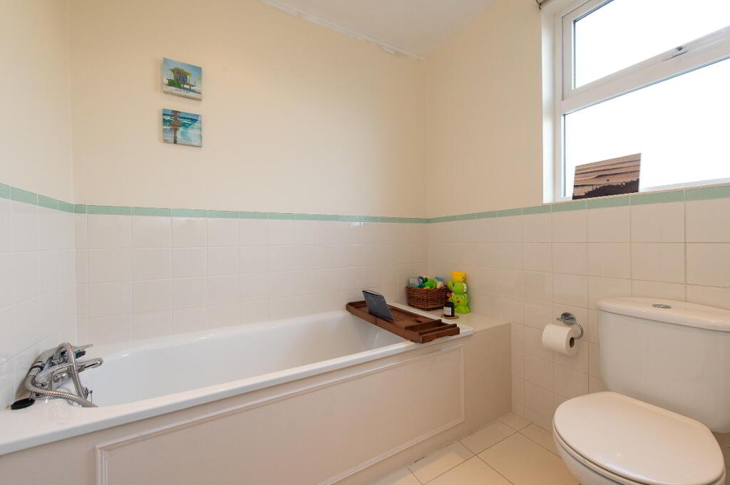 BATHROOM White suite comprising bath, telephone hand shower, low flush W/C, pedestal wash hand basin, wall tiling, ceramic tiled flooring, extractor fan, downlighters