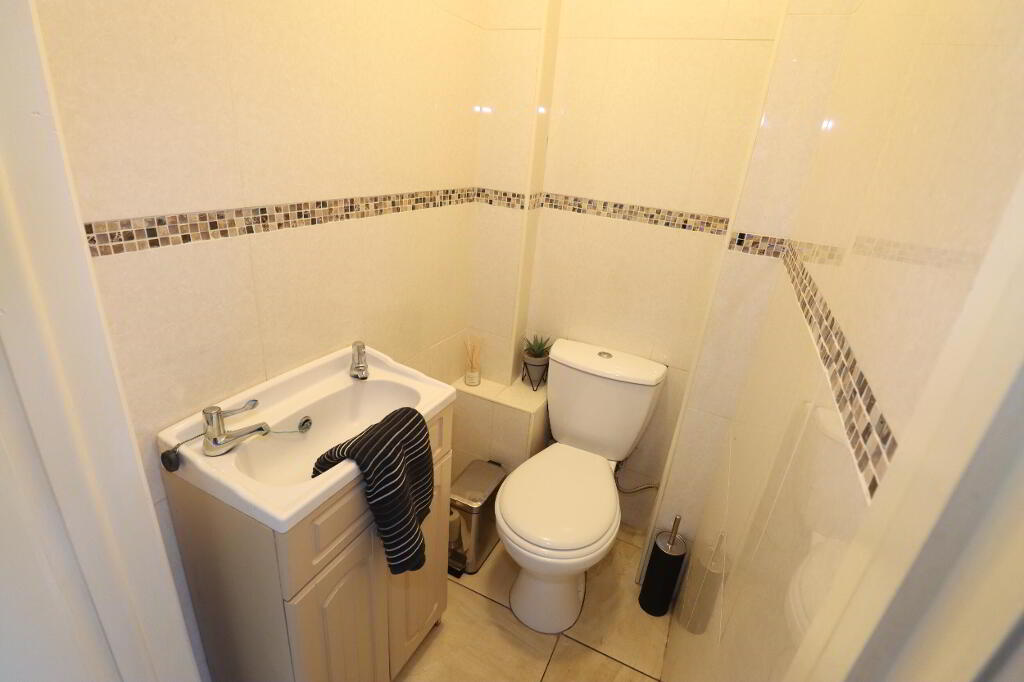DOWNSTAIRS W/C Low flush WC, vanity sink unit, ceramic tiled flooring, wall tiling