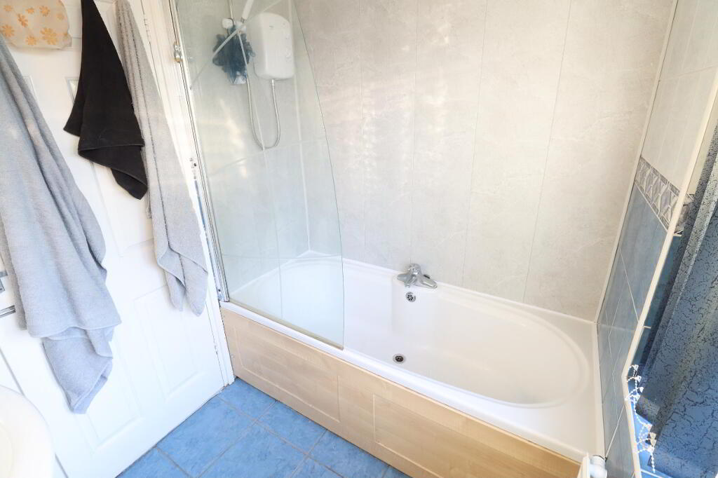 BATHROOM Panelled bath, electric shower, glazed shower screen, low flush W/C, pedestal wash hand basin, ceramic tiled flooring, wall tiling