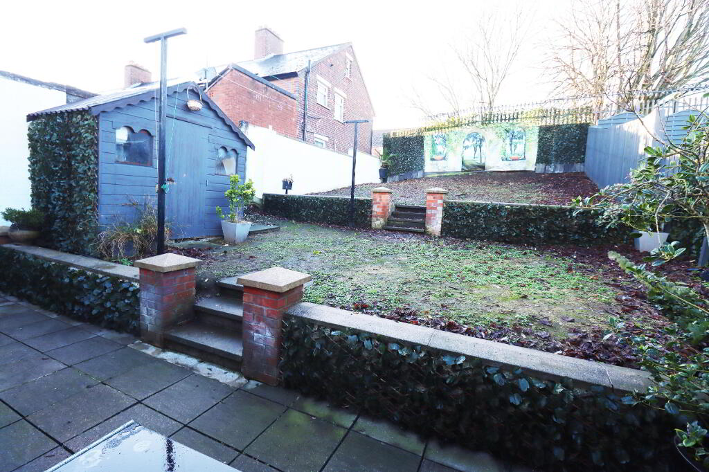 Rear: Generous and enclosed split level garden to the rear, paved patio area, shed, plants and shrubs, outside light