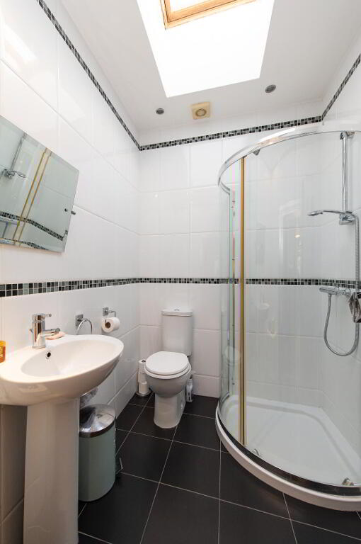 SHOWER ROOM Low flush W/C, pedestal wash hand basin, ceramic tiled flooring, shower unit with controlled shower, fully tiled walls, Velux window, downlighters, extractor fan