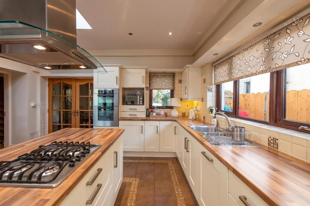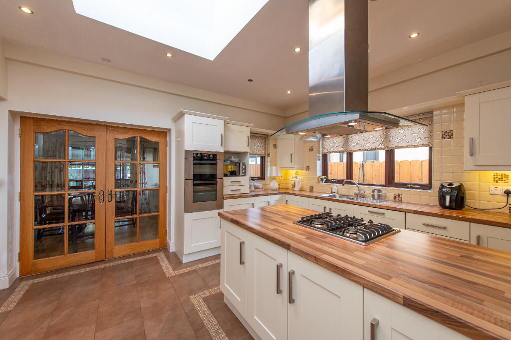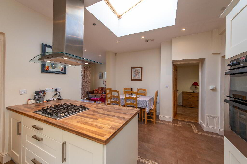 KITCHEN/ CASUAL DINING AREA 16' 8" x 11' 9" (5.08m x 3.58m) Built in high and low level units, round edge worksurfaces, single drainer stainless steel sink unit with mixer tap, vegetable sink, built in double oven, inlaid gas hob, stainless steel extractor fan, ceramic tiled flooring, sky light/ Velux window, downlighters, pelmet light, casual dining area
