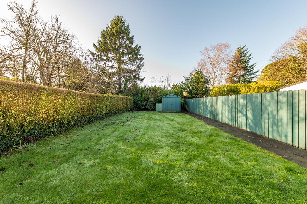 Rear: generous in neat lawn, plants, trees and shrubs, shed, paved patio area, light and tap