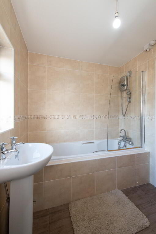 BATHROOM Modern white suite, panelled bath, electric shower and glazed shower screen, low flush W/C, pedestal wash hand basin, fully tiled walls, ceramic tiled flooring
