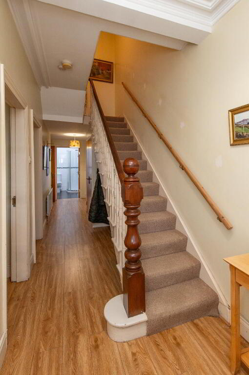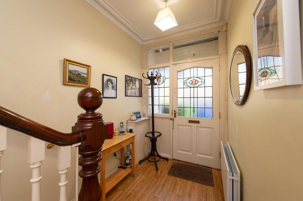 RECEPTION HALL Cornicing, stained glass door and side panel, laminate wood flooring, feature staircase