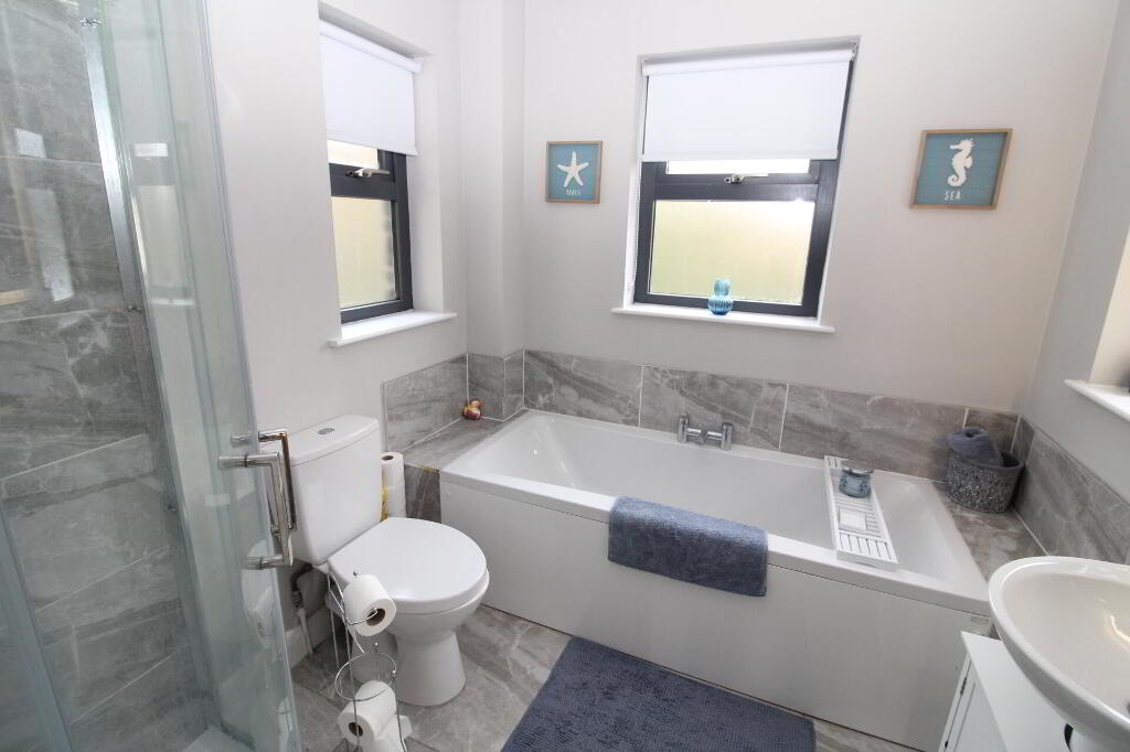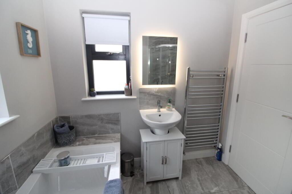 BATHROOM Modern white bathroom suite, wall hung pedestal wash hand basin with storage and mixer tap, low flush W/C, panelled bath unit with mixer tap, tiled shower enclosed with thermostatic shower, ceramic tiled flooring, electric heated mirror, downlighters, extractor fan, heated towel rail
