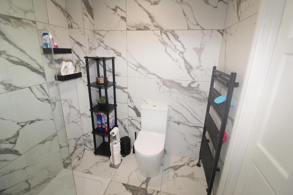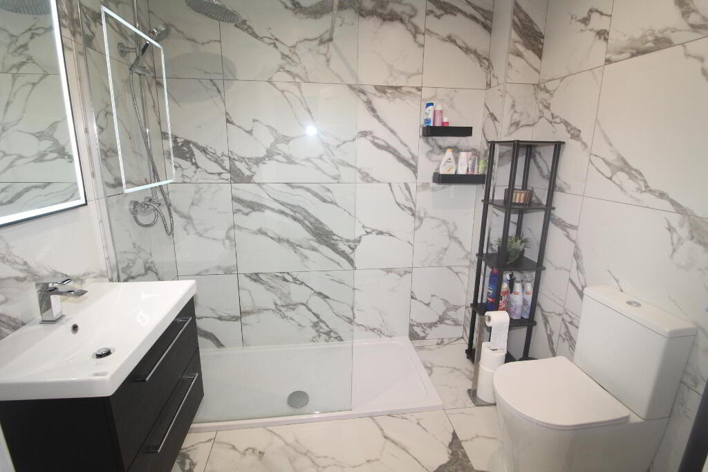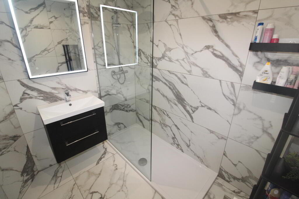 MODERNSHOWERROOM Walk in shower unit with thermostatically controlled shower and rainwater affect shower head, glazed shower screen, floating vanity sink unit with mixer taps, low flush W/C, luxurious wall and floor tiling throughout, heated towel rail, extractor fan