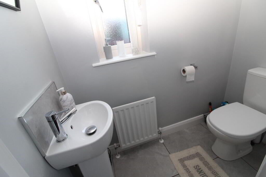 CLOAKS Low flush W/C, pedestal wash hand basin, tiled splashback, ceramic tiled flooring, extractor fan
