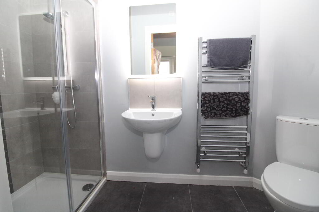 ENSUITE SHOWER ROOM Glazed shower cubicle with feature rainfall shower and separate hand held shower, half pedestal wash hand basin, low flush W/C, chrome heated towel rail, wall tiling, ceramic tiled flooring, LED mirror, extractor fan