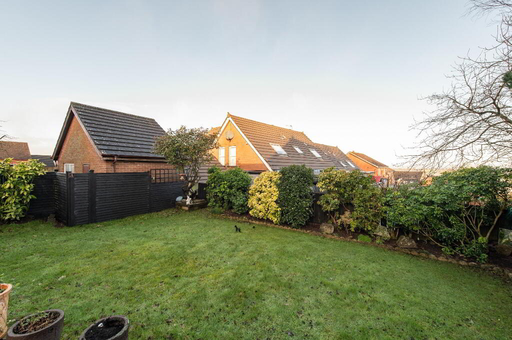 Rear: boiler house with Ideal gas boiler, patio area, lawn, plants and shrubs