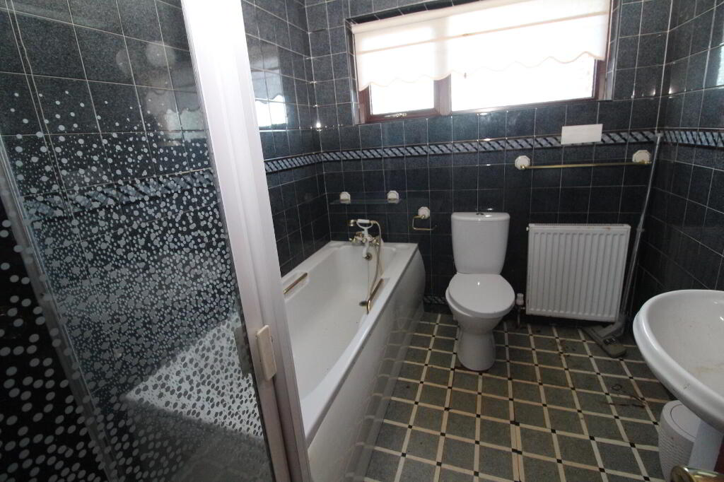 BATHROOM White suite comprising panelled bath, telephone hand shower, low flush W/C, pedestal wash hand basin, glazed shower cubicle with Triton electric shower, wall tiling