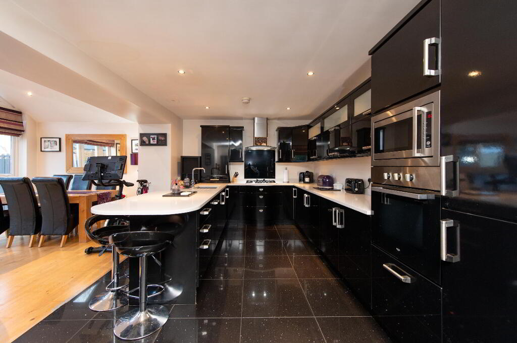 Range of high and low level units, Quartz stone work tops, gas hob, stainless steel extractor hood, single drainer Quartz stone sink unit with mixer taps, built in stainless steel oven, built in stainless steel microwave, built in dishwasher, built in fridge/freezer, vertical radiator, luxury tiled flooring, gas boiler, downlighters