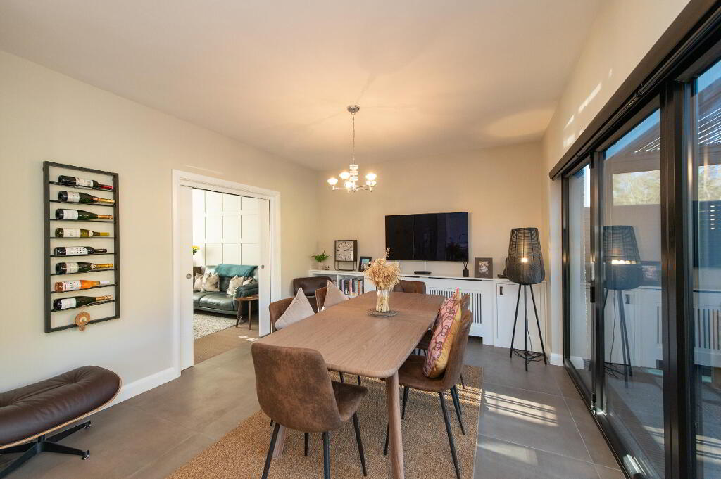 Casual dining area with built in cupboards, wired for flat screen, downlighters, built in folding door with electric blinds to patio area, feature pergola with electric heating, views towards Knockagh