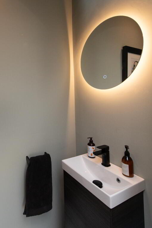 CLOAKS Low flush WC, vanity unit with mixer tap, ceramic tiled flooring, feature mirror, downlighters