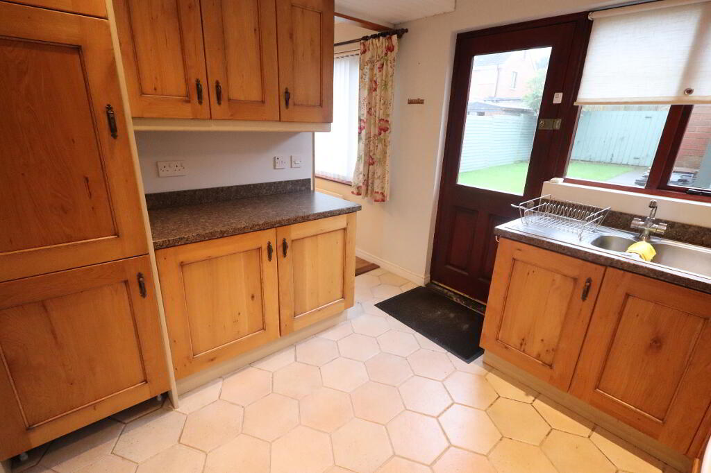 KITCHEN 9' 8" x 8' 11" (2.95m x 2.72m) Range of high and low level solid oak units, round edge work surfaces, built in fridge freezer, ceramic tiled flooring, single drainer stainless steel sink unit with mixer tap and vegetable sink, built in oven, inlaid hob, extractor hood, panelled ceiling, downlighters