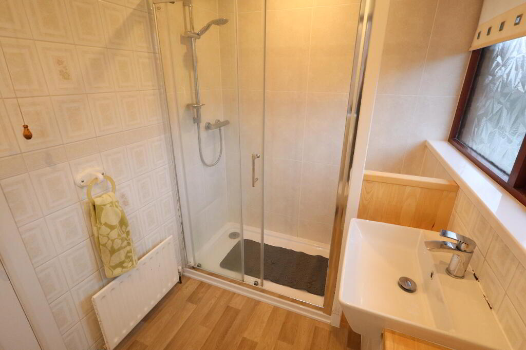 SHOWER ROOM Shower unit, thermostatic controlled shower, glazed shower screen, built in storage, low flush W/C, vanity sink unit with mixer tap, panelled ceiling, downlighters, wall tiling