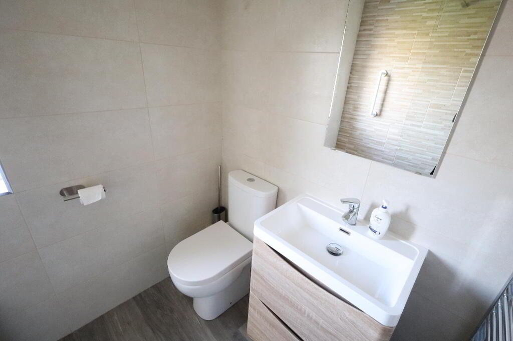MODERN SHOWER ROOM Shower unit with thermostatically controlled shower, glazed shower screen, low flush W/C, modern floating vanity sink unit with mixer taps, chrome heated towel rail, extractor fan, wall tiling