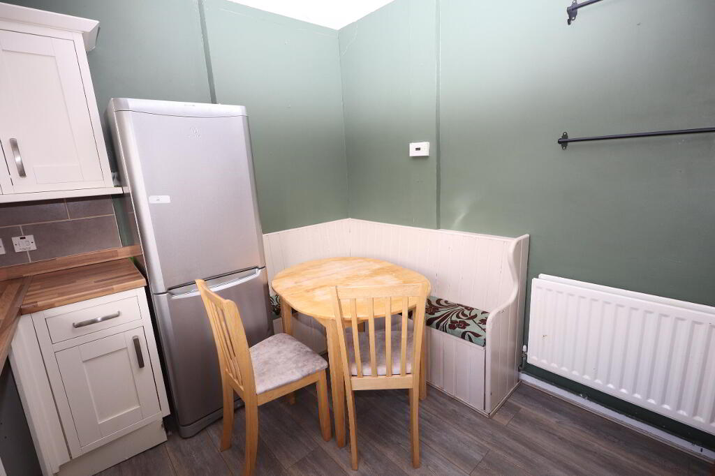 KITCHEN 10' 4" x 9' 1" (3.15m x 2.77m) Range of high and low level ivory shaker style units, round edge worksurfaces, single drainers stainless steel sink unit with mixer taps, plumbed for washing machine, built in oven and hob, extractor fan, plumbed for washing machine, wall tiling, laminate wood flooring, built in seating area