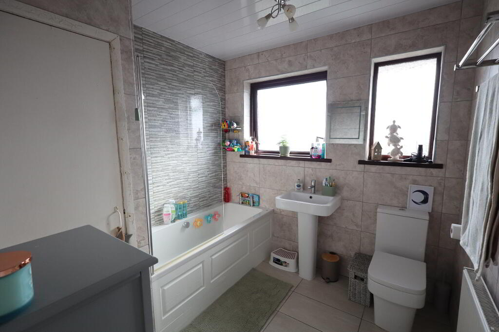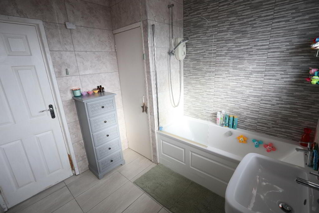 BATHROOM Jacuzzi bath with mixer tap, electric shower, ceramic tiled flooring, low flush W/C, pedestal wash hand basin, wall tiling, built in storage with Worcester boiler, PVC panelled ceiling
