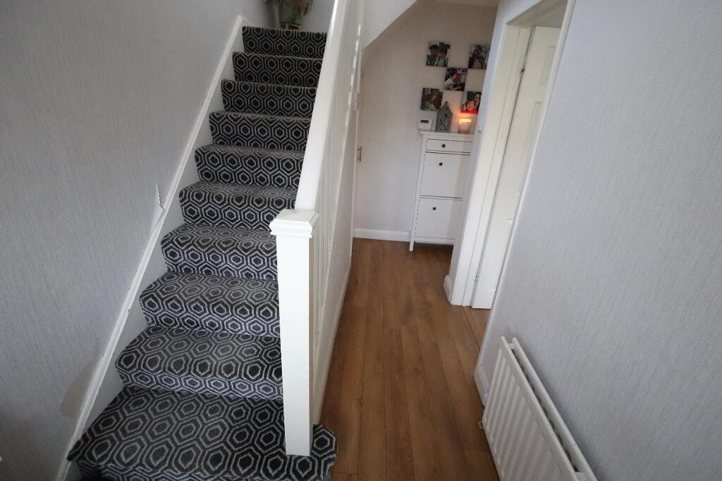 ENTRANCE HALL Laminate wood flooring, understairs storage with access to basement with light and power, shoe rack, uPVC front door, cornicing