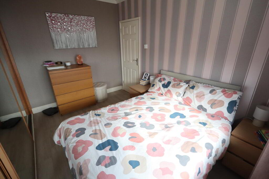 BEDROOM (1) 11' 11" x 7' 10" (plus built in robes)(3.63m x 2.39m) Built in slide robes, laminate wood flooring, views of Belfast, cornicing