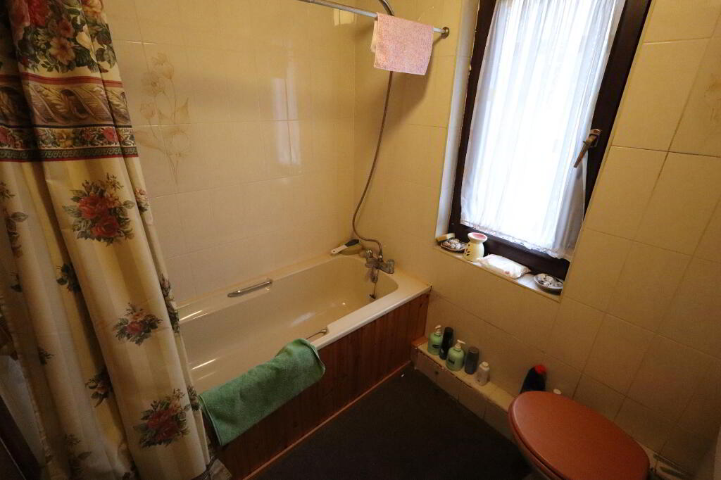 BATHROOM Panelled bath unit, controlled shower, low flush W/C, wall tiling, pedestal wash hand basin