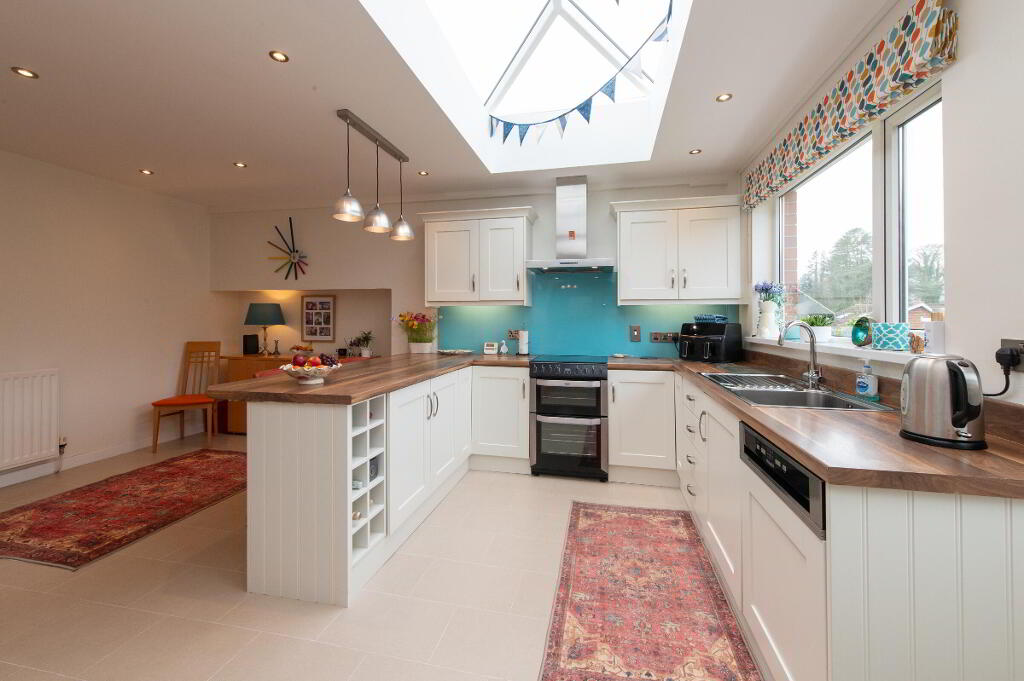 KITCHEN/DININGAREA17' 8" x 17' 5" (5.38m x 5.31m) At widest points. 10' 9" x 10' 8" (3.28m x 3.25m) at narrow points: Range of built in high and low level units. Round edge work surfaces. Breakfast bar. Integrated wine rack. Single drainer Franke stainless steel sink unit with mixer tap. Integrated dishwasher and fridge freezer. Plumbed for automatic washing machine. Stainless steel extractor fan. Custom fitted glass splash back. Concealed lighting. Downlighters and feature pendant lights. Roof lantern. Karndean flooring. Open plan to: