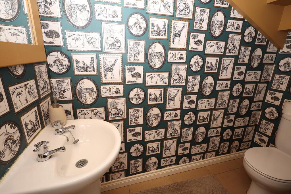 DOWNSTAIRS W/C Push button W/C, pedestal wash hand basin with mixer tap, ceramic tiled flooring