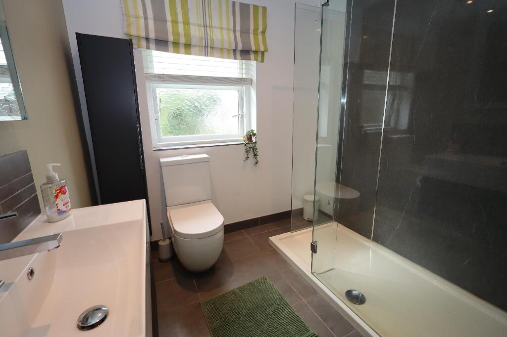 BATHROOM Modern 3 piece shower room suite comprising double walk in shower unit with Mira electric shower, push button W/C, half pedestal wash hand basin with mixer tap and storage, powered mirror, heated towel rail, ceramic tiled flooring, downlighters, shelved hot press