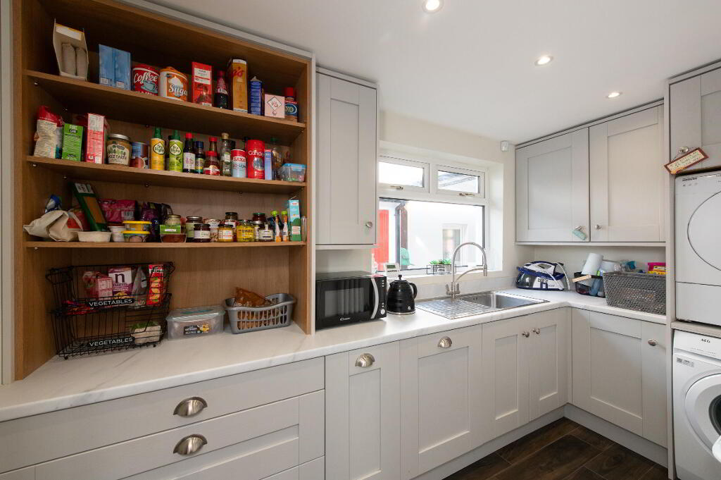 UTILITY ROOM Built in units, round edge work surfaces, single drainer stainless steel sink unit with mixer tap, dishwasher, display units, ceramic tiled flooring, downlighters