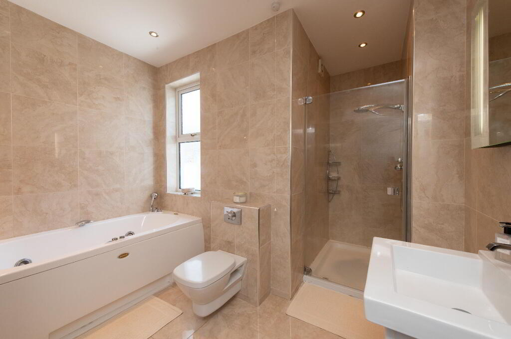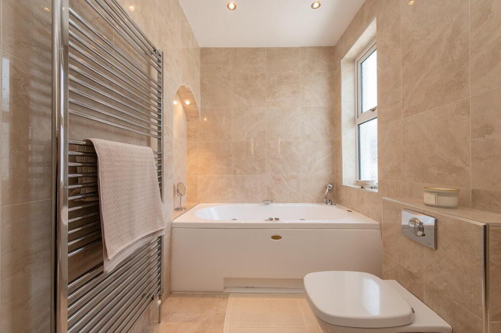 BATHROOM White suite, Jacuzzi bath with mixer tap, telephone hand shower, wash hand basin, high flush W/C, heated towel rail, ceramic tiled flooring, shower unit with controlled shower