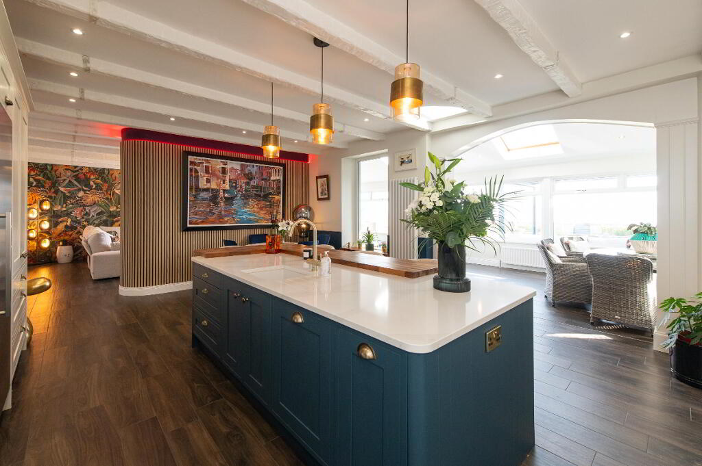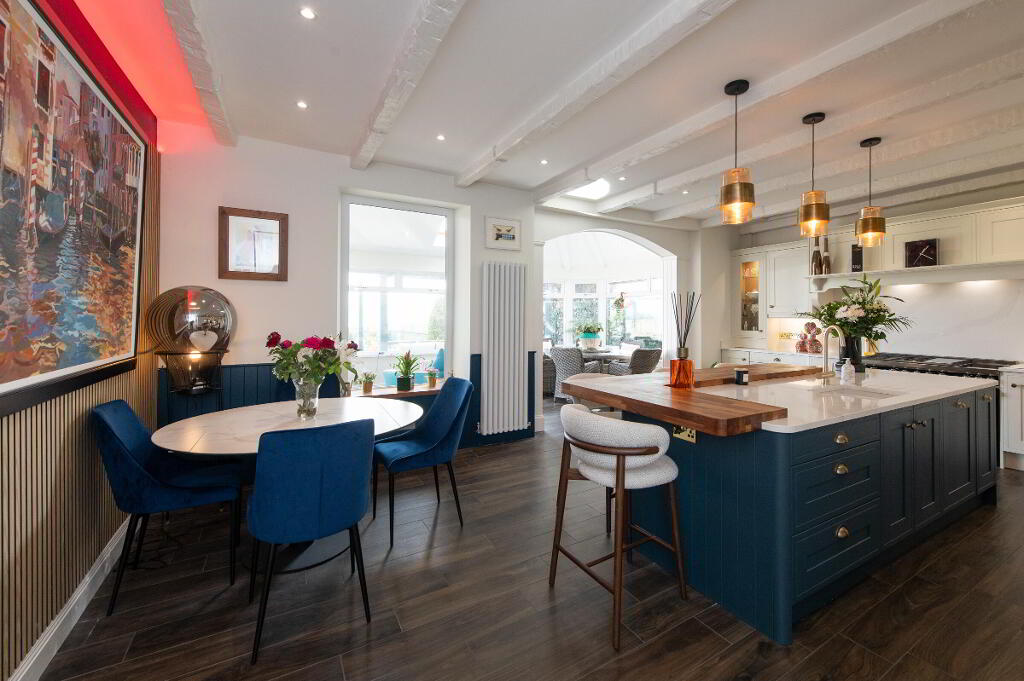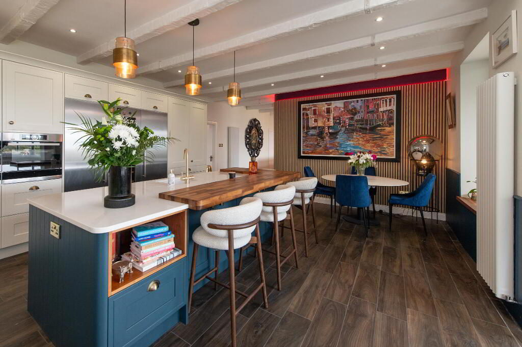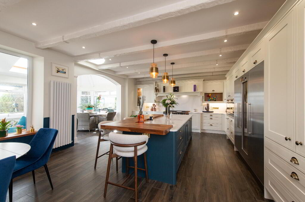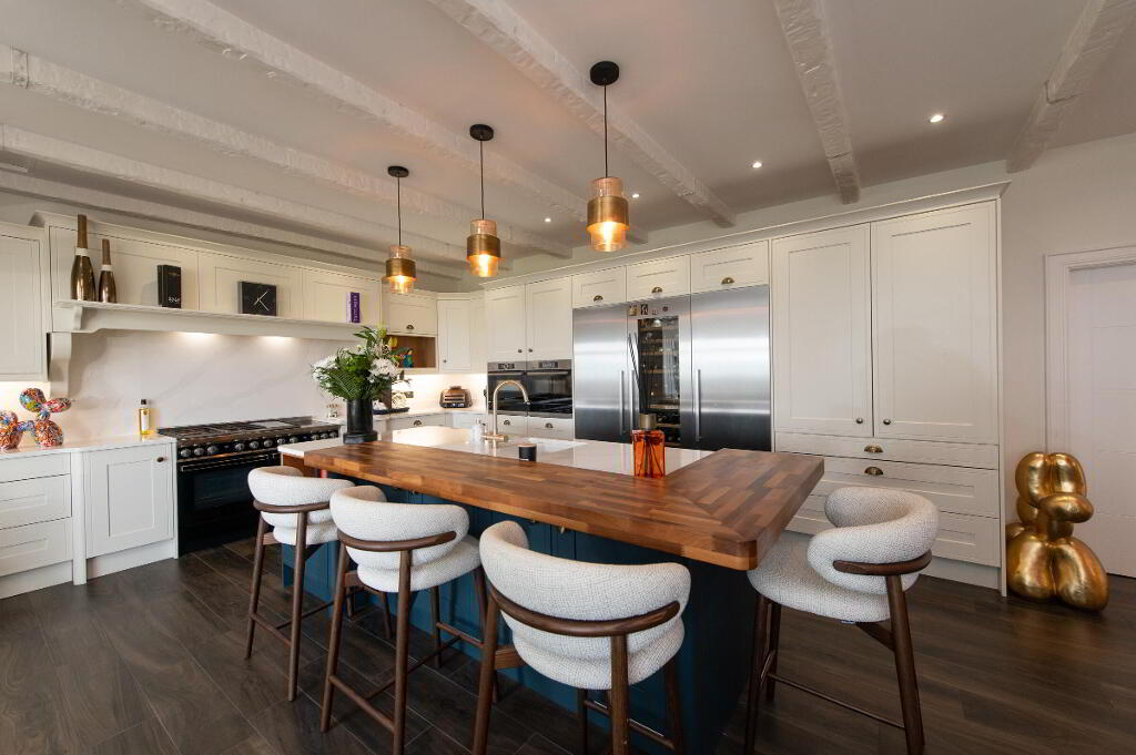 LUXURY KITCHEN 23' 0" x 17' 0" (7.01m x 5.18m) Range of high and low level units, marble work surfaces, built in twin Smeg and Bosch ovens, extractor fan, twin fridges, wine rack, island unit incorporating single drainer mixer tap, dishwasher, beam ceiling, downlighters, ceramic tiled flooring, display units, butler's pantry, casual dining area.