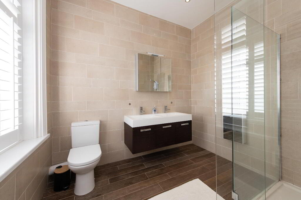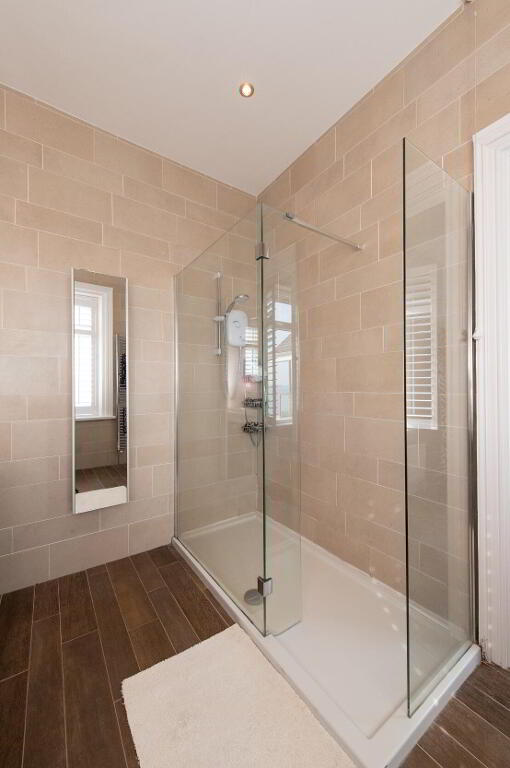 ENSUITE SHOWER ROOM Low flush W/C, vanity unit with twin sinks, shower unit with electric shower, ceramic tiled flooring, downlighters, heated towel rail