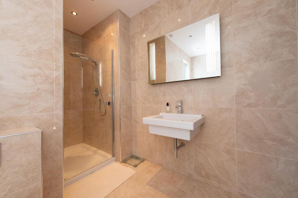 ENSUITE SHOWER ROOM Low flush W/C, vanity unit, ceramic tiled flooring, shower unit with controlled shower and overhead rain shower