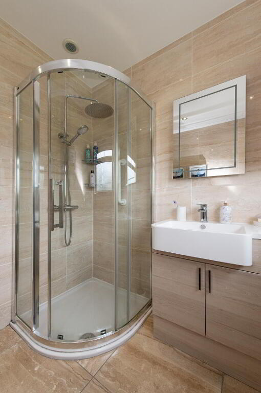 SHOWERROOM Thermostatic controlled shower with rainforest shower head. Vanity unit with work surface and display cabinet. Low flush wc. Extractor fan. Downlighters. Luxury floor and wall tiling.