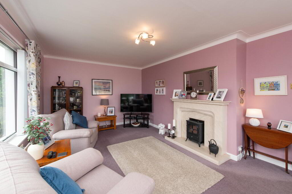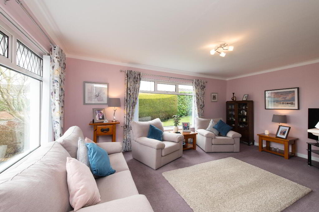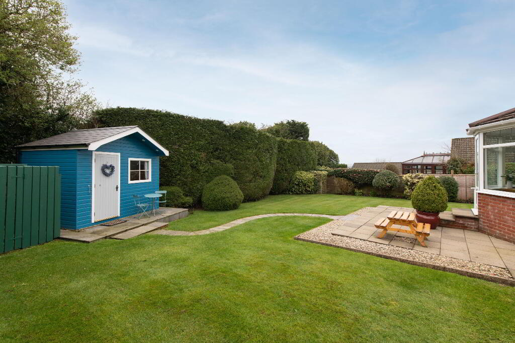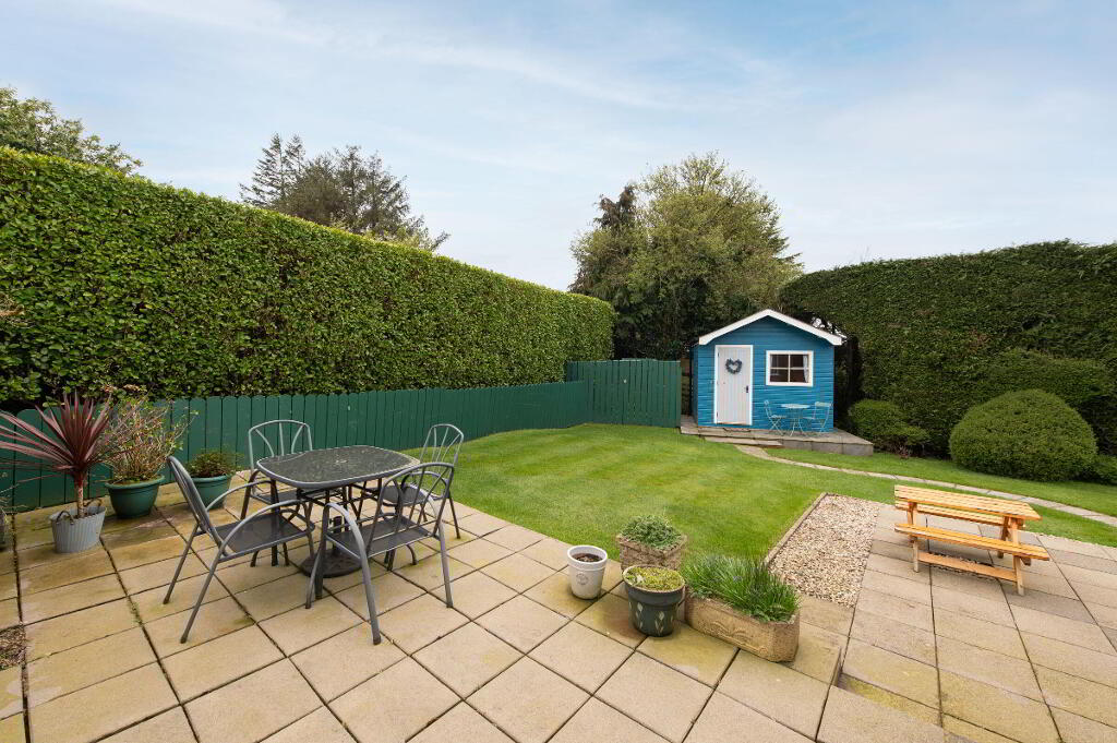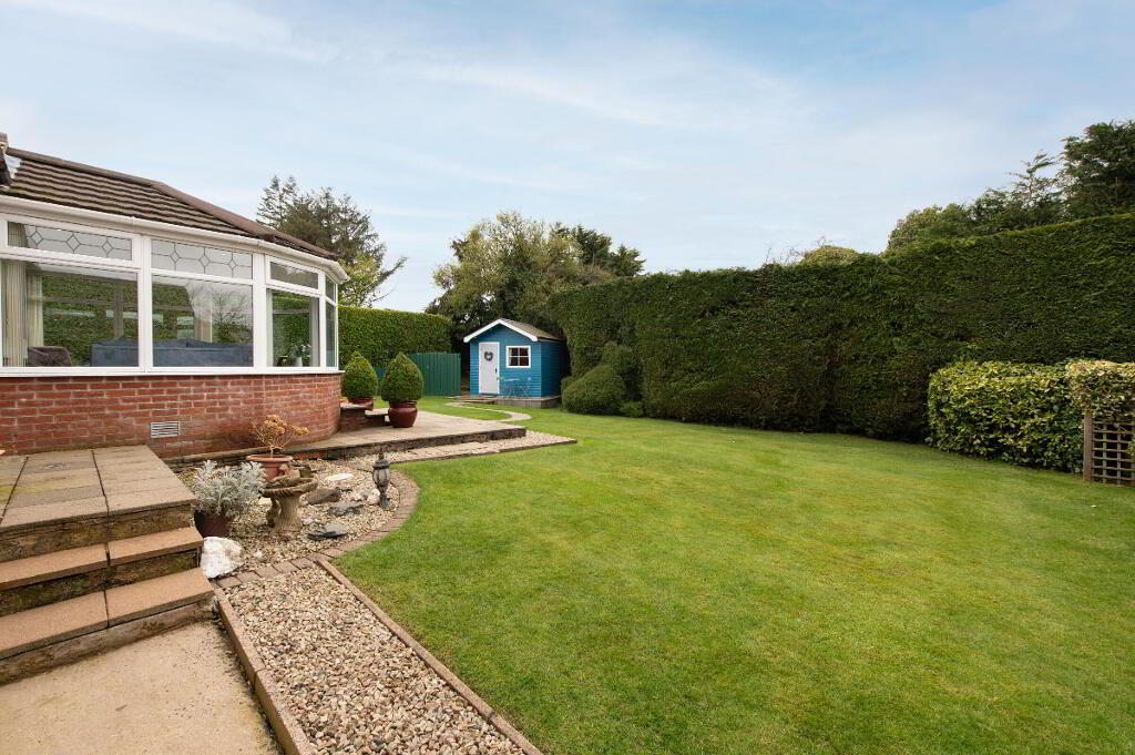 OUTSIDE Generous corner site. Front garden laid in lawn bounded by hedging with variety of plants trees and shrubs. Car parking. Rear garden with garden house on raised platform, light and power. Paved patio area. uPVC facia and rainwater goods. Outside light and tap.