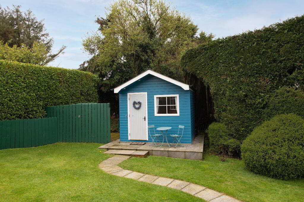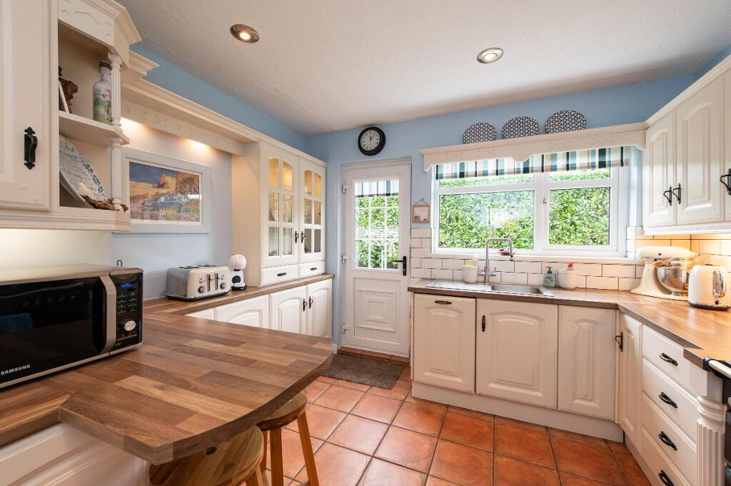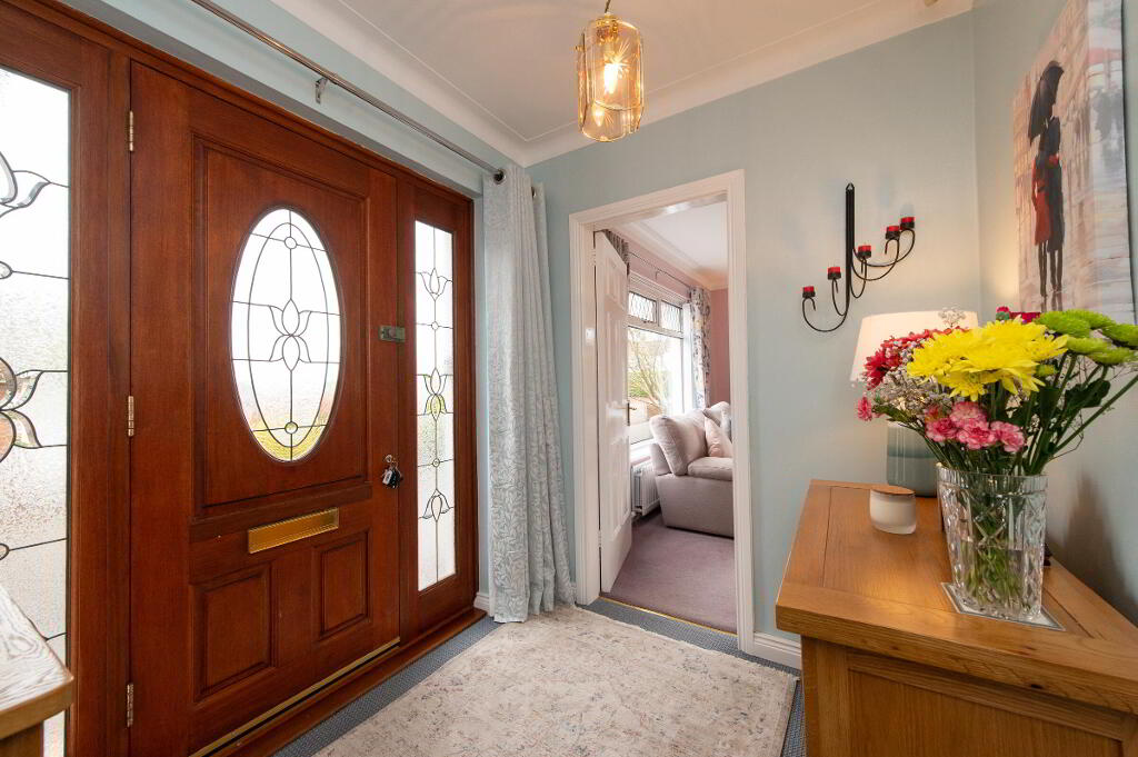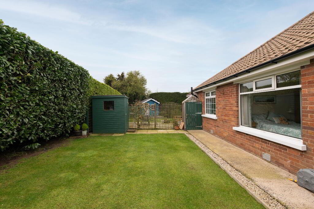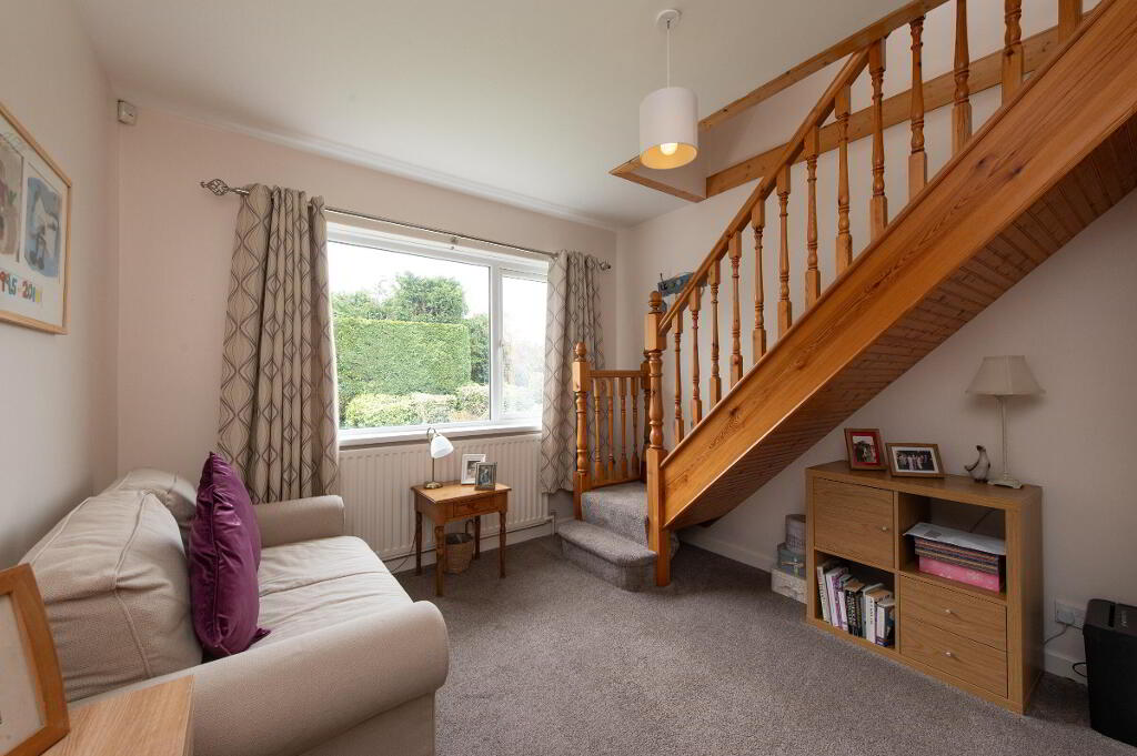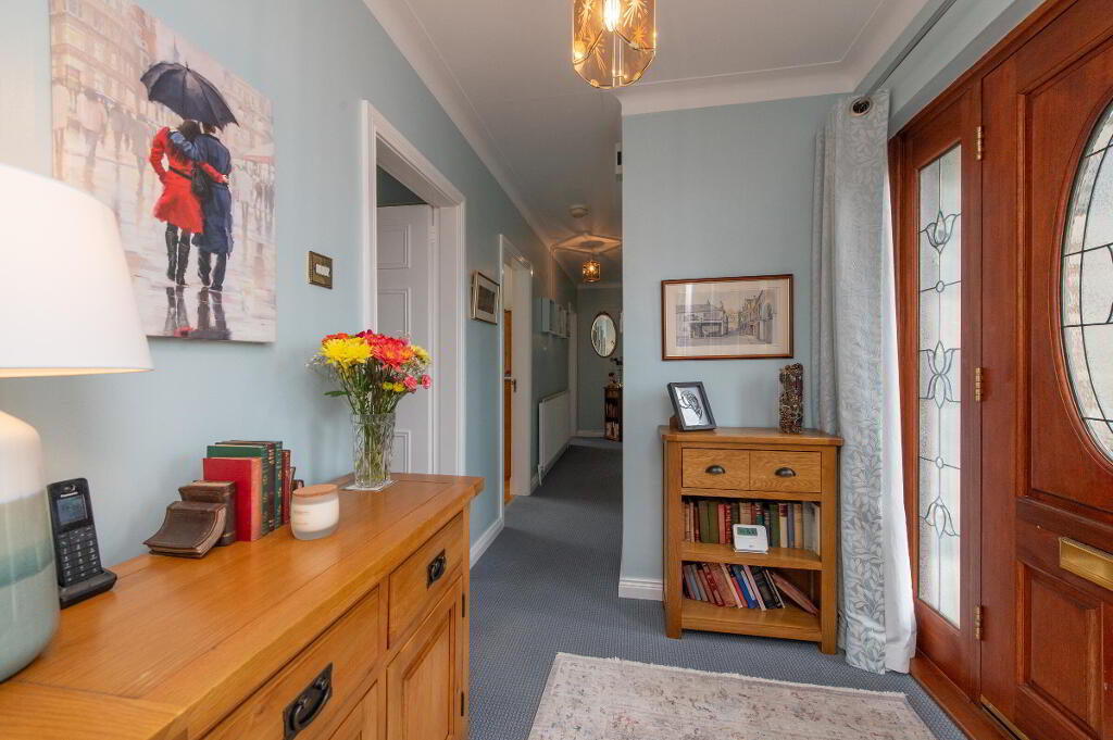 OUTSIDE Generous corner site. Front garden laid in lawn bounded by hedging with variety of plants trees and shrubs. Car parking. Rear garden with garden house on raised platform, light and power. Paved patio area. uPVC facia and rainwater goods. Outside light and tap.