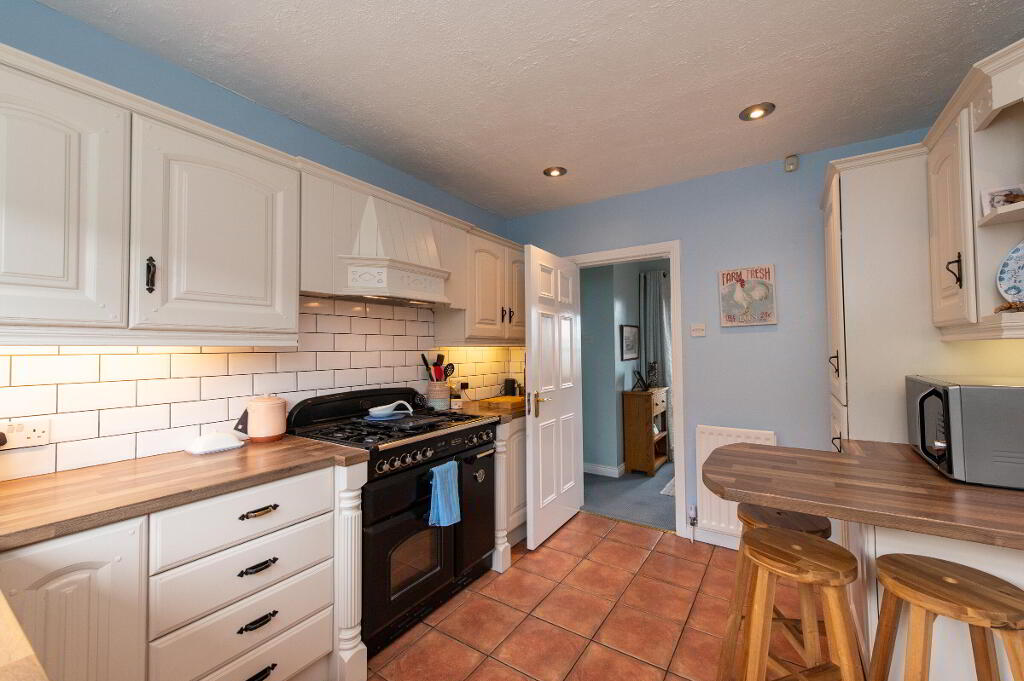 KITCHEN11' 5" x 10' 4" (3.48m x 3.15m) Range of built in high and low level units. Display units. Breakfast bar. Single drainer stainless steel sink unit with Mixer Tap. Integrated fridge freezer. Integrated dishwasher. Extractor fan. Round edge work surfaces. Concealed lighting. Ceramic tiled floor. Wall tiling. Pelment. Downlighters.