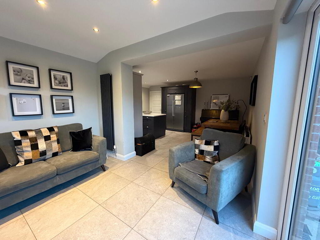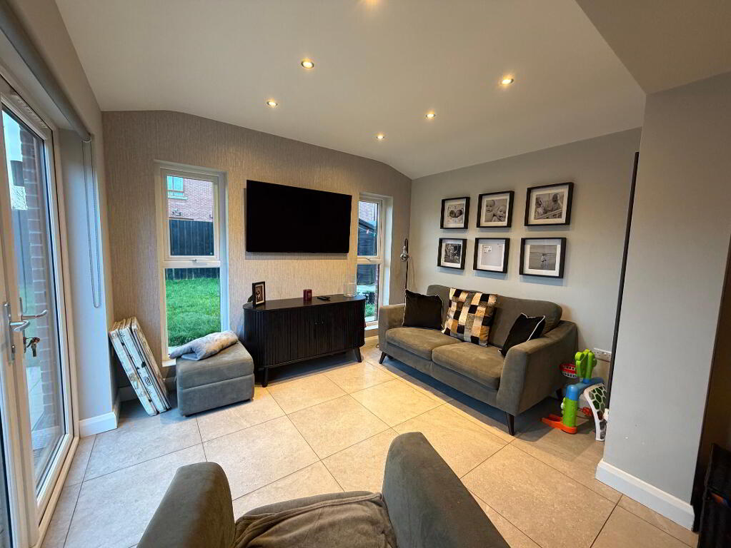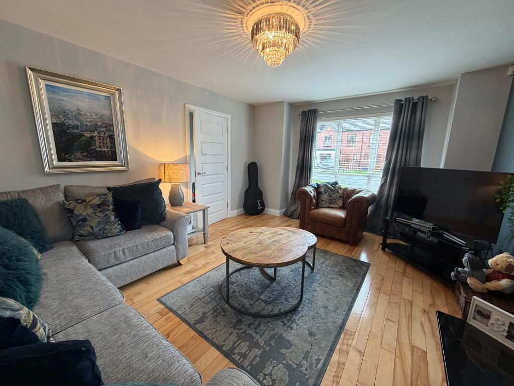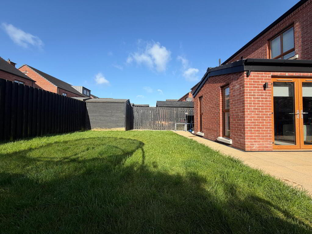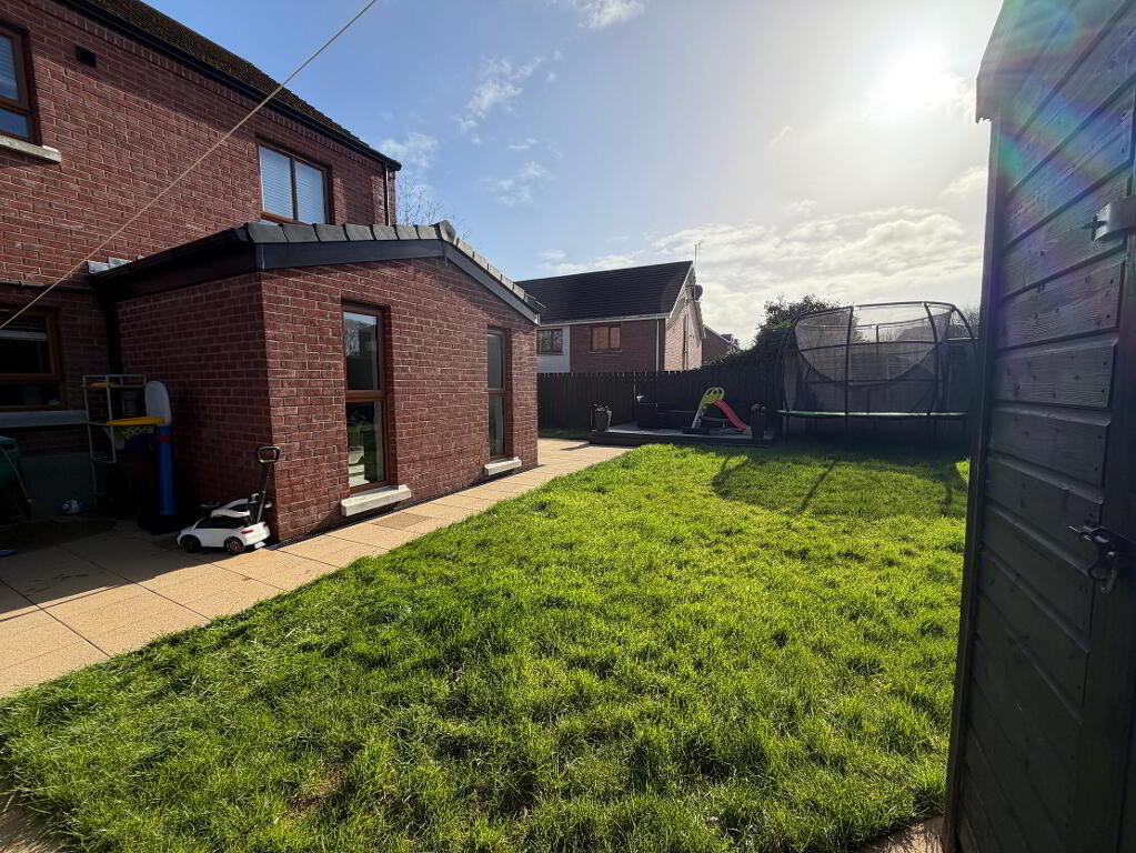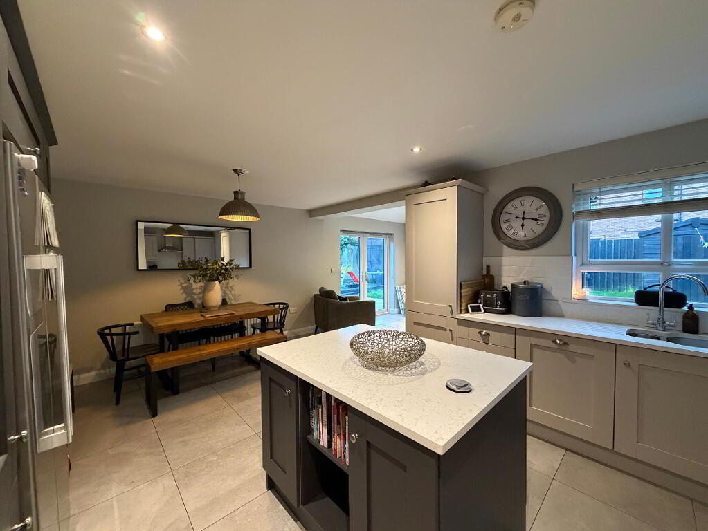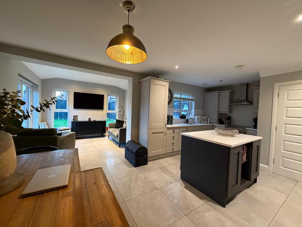 This spacious semi-detached villa offers generous ground floor accommodation, thoughtfully designed for modern family living. The welcoming lounge features a charming multi-fuel stove, creating a cosy and inviting focal point. At the heart of the home is a stylish shaker-style kitchen complete with integrated appliances and a central island unit. The kitchen flows seamlessly into an open-plan casual dining area, which in turn leads directly into a bright sun room, creating a superb open-plan layout ideal for both everyday living and entertaining. Externally, the property enjoys a private garden with a desirable southerly aspect — perfect for relaxing and making the most of sunny days. Occupying a quiet cul-de-sac position within a highly sought-after location, this impressive home will particularly appeal to young couples and families alike.